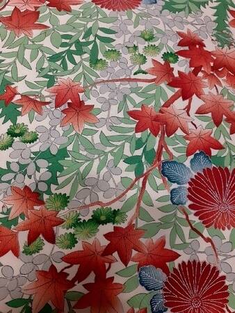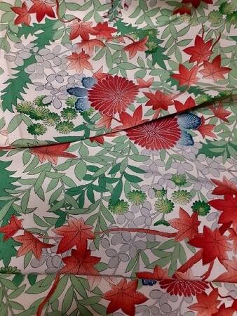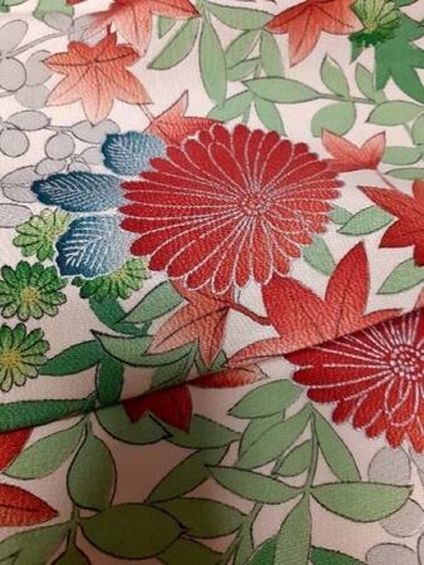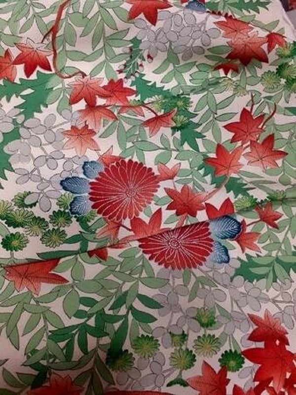 Magnifique coupon ancien en crêpe de soie avec de grandes fleurs et des feuilles. Certaines fleurs sont bordées d'argent.