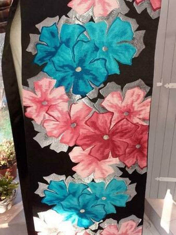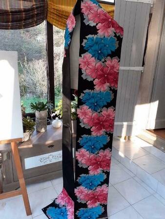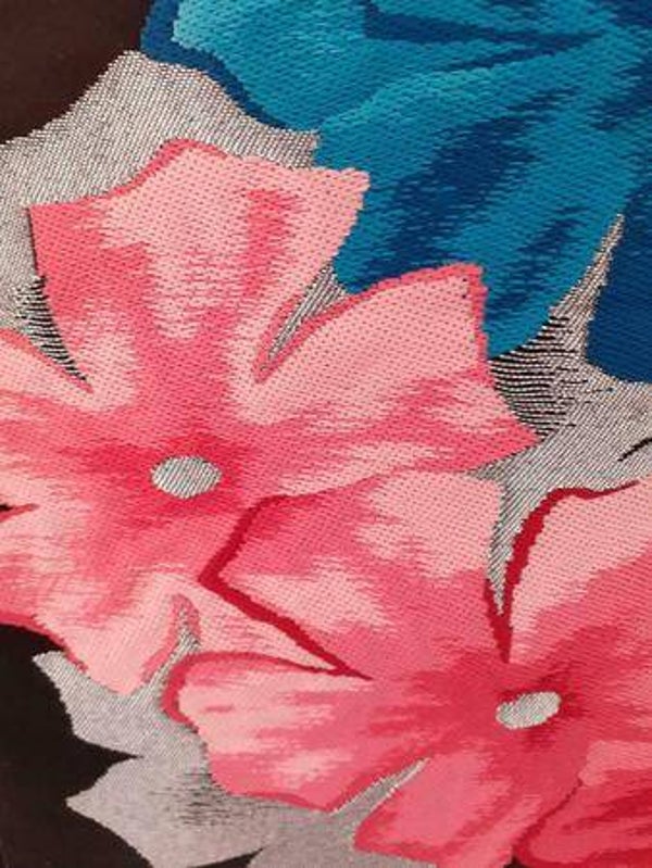 Motif : fleurs turquoises et roses tissées avec de l'argent sur de la soie noire.