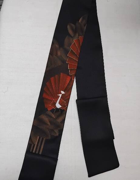 Soie japonaise ancienne / vintage douce et souple, avec un paon peint à la main et une subtile bordure dorée. Écharpe au design unique.