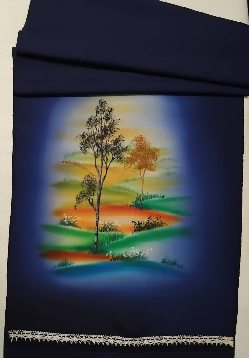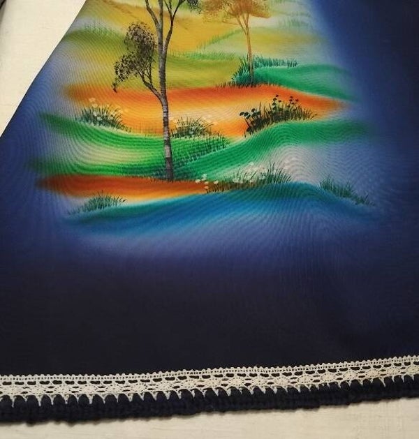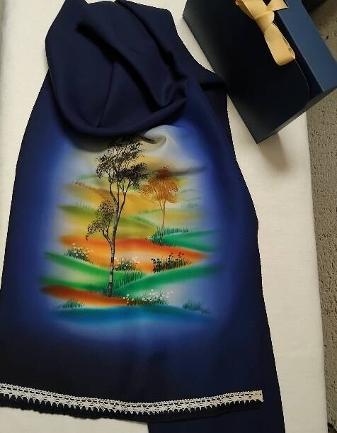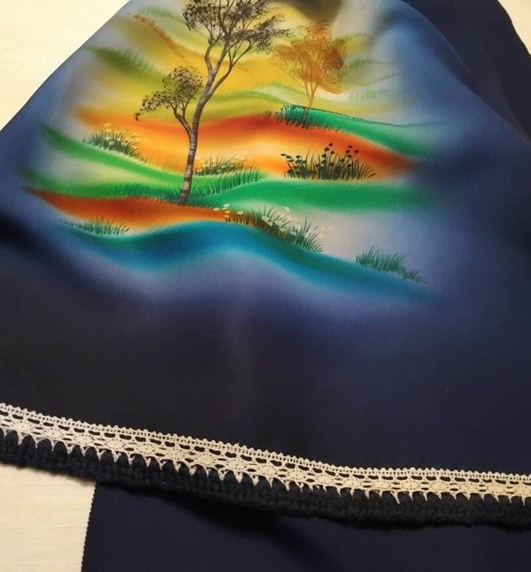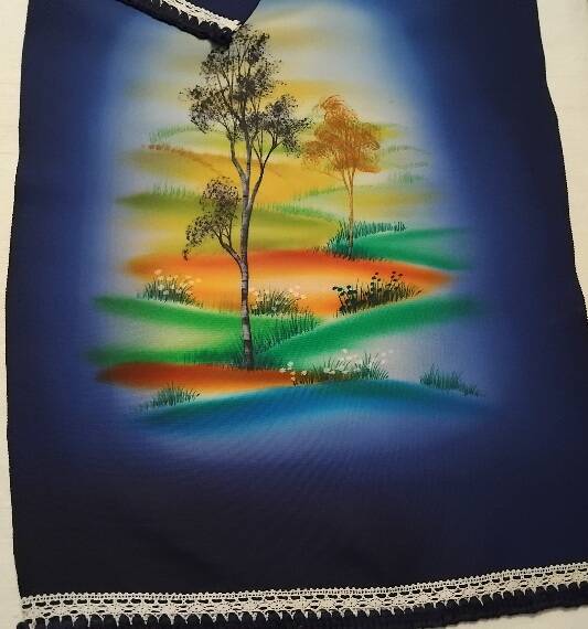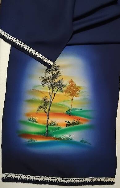 Cette écharpe est fabriquée à partir de soie naturelle antique teinte à la main. Elle est de couleur bleu indigo. L'artiste a peint de magnifiques arbres dans les collines dans des couleurs vraiment envoûtantes.