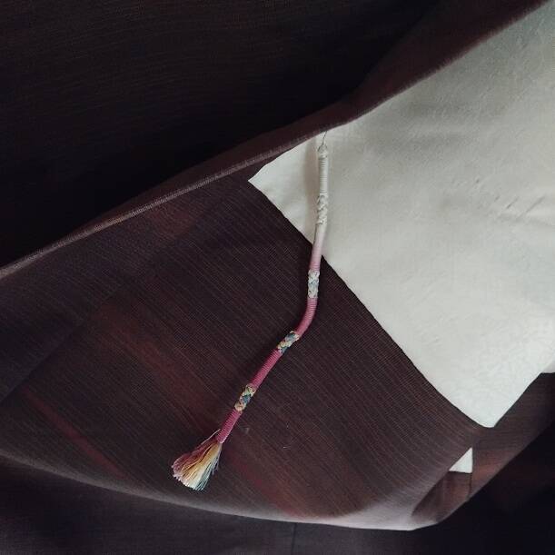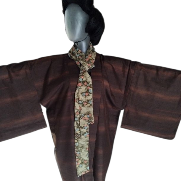Cette veste en soie naturelle légèrement brillante est fabriquée à la main à partir de soie tsumugi (sauvage). Elle a très probablement été teinte à la boue, car le fond de la veste est noir et la couche supérieure est marron, moka, avec des lignes légèrement rouge foncé.