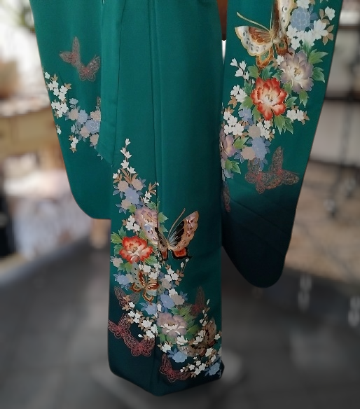 Ce furisode en soie japonaise vintage 100% naturel a une couleur vert émeraude à couper le souffle et un beau motif.
