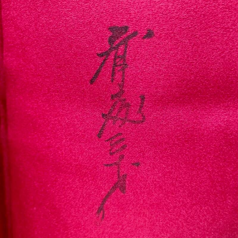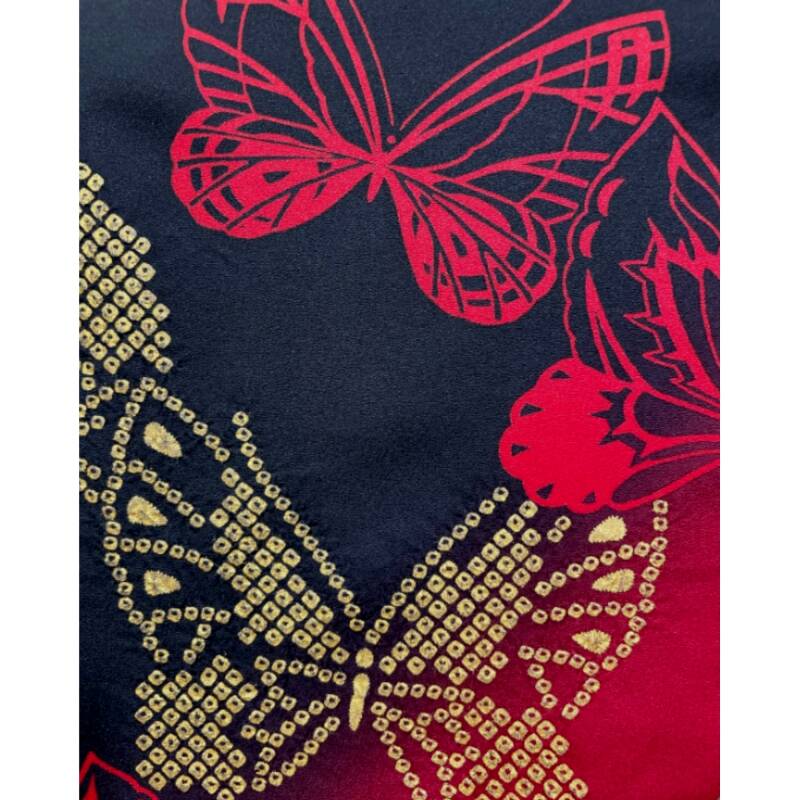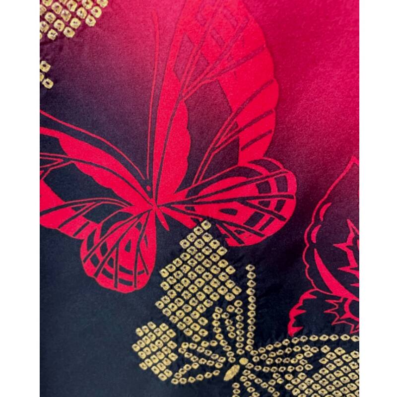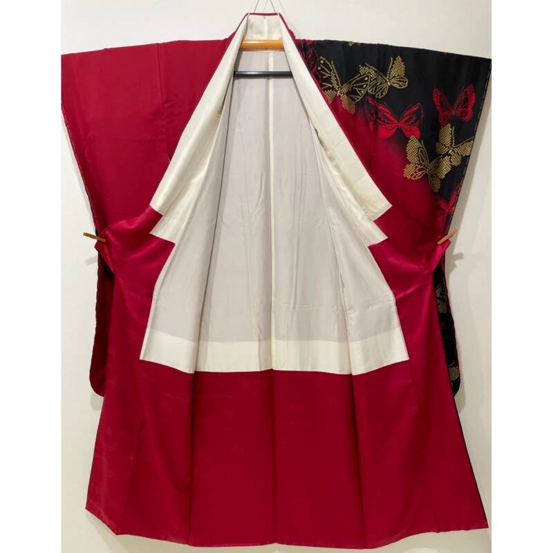 Cette nouvelle furisode en soie japonaise vintage naturelle est de couleur Enji (carmin) avec une finition noire. La bordure présente des papillons peints à la main et des papillons shibori.