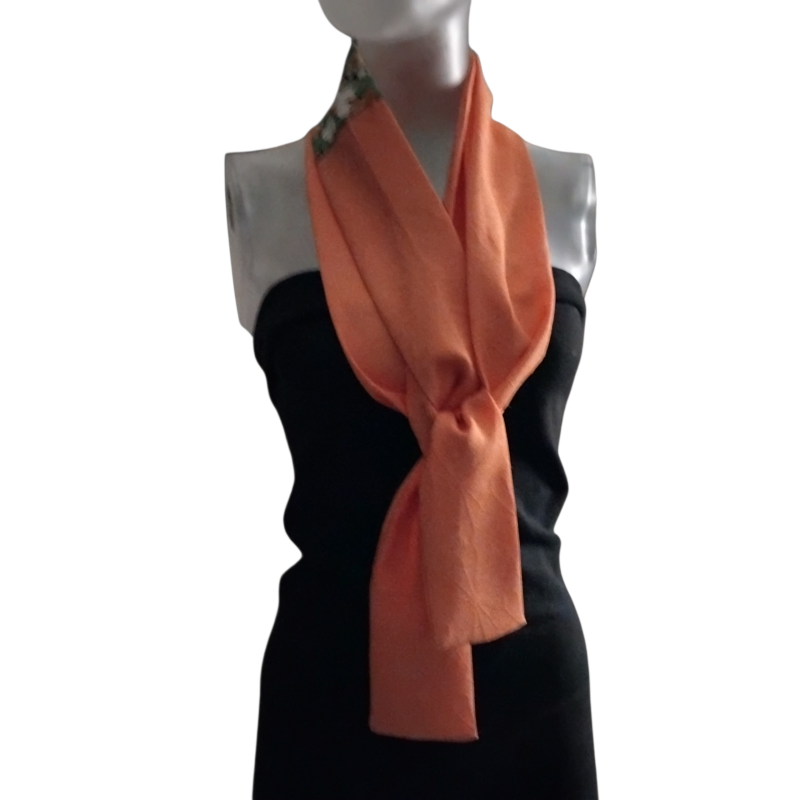 Écharpe, ceinture en soie naturelle douce. Cette soie de couleur orange saumon profond est magnifiquement tissée avec un léger relief de fleurs royales. Un bloc de fleurs est cousu dans l'écharpe, ce qui crée un très bel effet.